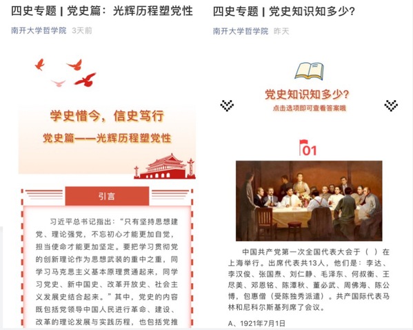 知史惜今强定力。学院以党建带团建思路,由哲学院硕士生第一党支部牵头,党员分组开展“四史”学习,同时制作历史知识与趣味题目系列推送。本硕各团支部以团小组为单位展开学习,并将学习心得打卡分享。内容涵盖共产党成立以来、新中国成立以来以及改革开放以来的重大事件、重要会议、重要文件、重要人物等进行介绍,回顾我们党领导人民进行艰苦卓绝的斗争历程,介绍中国近代以来的斗争史、我们党成立以来的奋斗史、新中国成立以来以及改革开放以来的发展史,内容丰富,引导青年学生深刻认识红色政权来之不易、新中国来之不易、中国特色社会主义来之不易,吸引了学院同学的广泛参与。